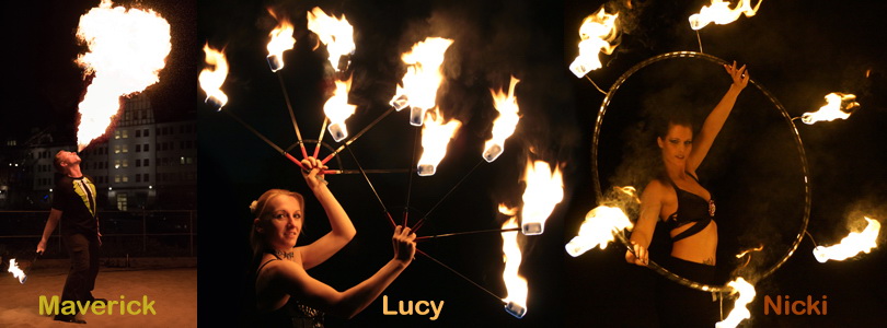 Elemente: Feuerspucken, Feuerfächer, Feuerreifen, Feuerseil, Pois, etc.