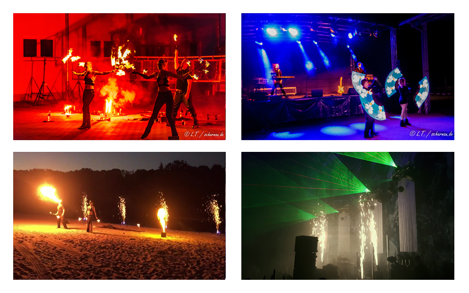 Showinhalt: LED-Feuershow mit pyrotechnischen Effekten, Effektgeräte und Lasershowelementen
