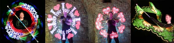 In dieser Show verwenden wir LED-Equipment, die mit individuellen Grafiken, Logos und Lichtshows programmierbar sind. Dadurch ergeben sich bei den Shows nicht nur faszinierende Farbmusterwechselspiele, sondern wir können Logos, Slogans, Bilder und andere grafische Umsetzungen realisieren.